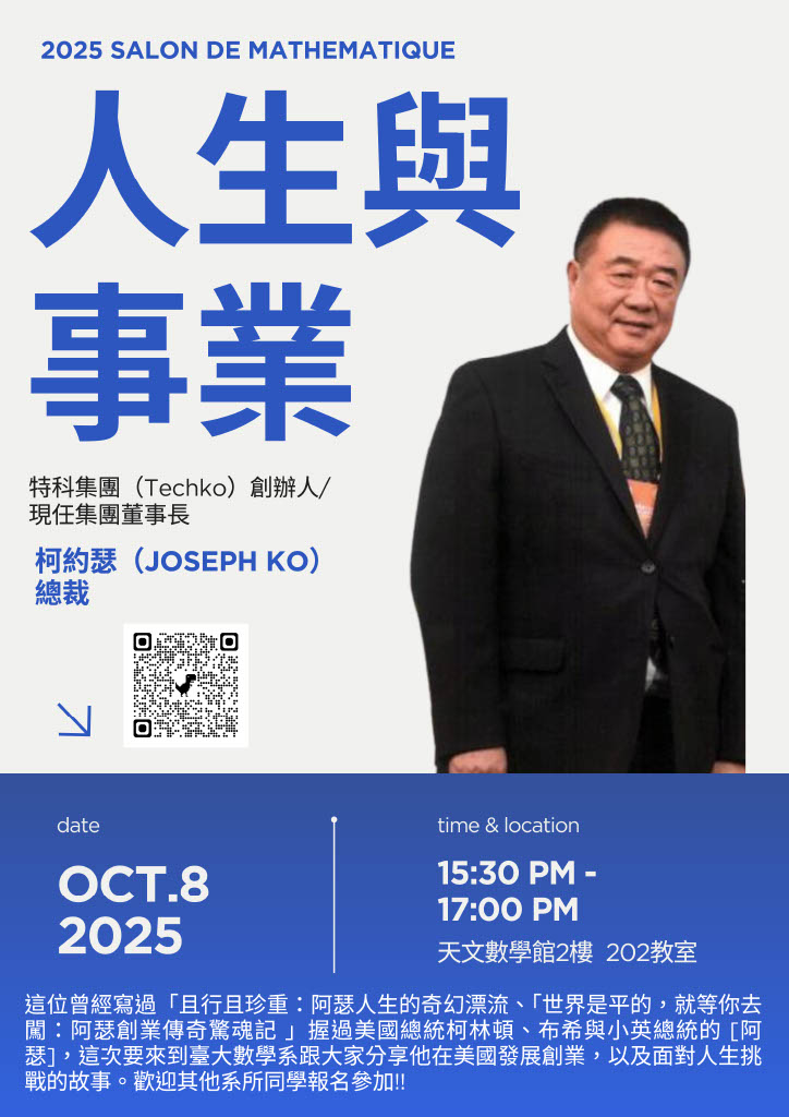 本場數學沙龍邀請 Techko 集團創辦人/董事長柯約瑟總裁,以多年跨域與國際經營經驗,分享從創業到組織管理的關鍵思維:在不確定中抓核心、把專業轉成可複製的價值、用紀律與長期主義經營人生。