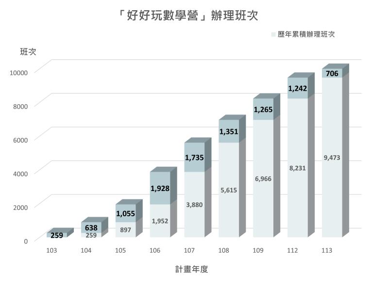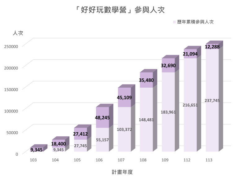 好好玩數學營 教育部於102年整合「國民小學及國民中學補救教學實施方案」,期能依學生個別學力程度提供適切的學習資源,以幫助國中小學生改善學習成效及提升學習動機。故自103年度起,教育部國民及學前教育署委託本中心執行「就是要學好數學(JUST DO MATH)」計畫以推廣辦理「好好玩數學營」。 一、活動宗旨 推廣「奠基」觀點、培養「自主」能力及強化「操作」教學,以奠定學生學習數學之興趣、激發學生主動探索之能力以及顛覆傳統數學之學習模式。 二、辦理理念 透過趣味的數學活動提升學生內在學習動機,並在參與培訓後的教師帶領下,使每位學生皆能有趣、有感、有能的學好數學。 三、申辦流程 四、本中心歷年度辦理班次及人次累計圖(110-111年度由各縣市辦理)