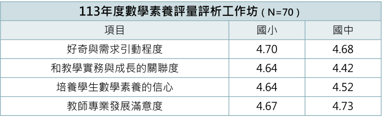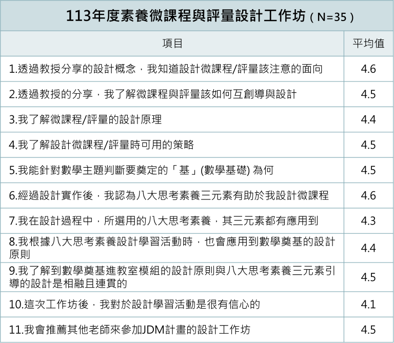 問卷與訪視 JDM計畫自103年發展至今,由為學生奠基數學想法、提升數學學習動機,乃至因應十二年課綱的實施進一步以培養學生數學素養為目標,一直致力於發展、實施促進學生學習、精進教師教學與評量知能的各項活動。其中,JDM計畫概分為三面向,包含教案/模組包研發、準講師/教師培訓及學生學習活動等三大領域。於各領域中,不同業務配合訪視與問卷,以利深入了解計畫執行成效,亦有利計畫調整與修改未來發展方向。 問卷 模組教案研發 設計師工作坊 為使奠基模組開發更為順利,中心於104-106年度開設的「奠基模組設計師培訓工作坊」、106-108年度開設的「奠基進教室模組設計師培訓工作坊」、111年度開設的「素養微課程研發工作坊」與「素養評量設計工作坊」、112年度開設的「學習活動設計工作坊」與「素養評量設計工作坊」與113年度開設的「素養微課程與評量設計工作坊」,希望透過有系統的培訓,使學員們設計的模組與評量更加完備。而回饋問卷有助於數教中心及數學教育界了解「設計師工作坊」對現場老師們的幫助,並使其更加完善。以113年度工作坊為例,更多工作坊內容請點擊前往「教師為設計者」頁面。 教師專業發展 準講師培訓(已停止辦理) 109年度開始,JDM研發團隊歷經半年腦力激盪,定調的有效策略是「精進教師的提問」,並持續辦理「準講師培訓工作坊」至111年度,其中依據模組包類型不同,分為109素養模組包與21世紀素養模組包兩種準講師培訓工作坊,以教學影片及其逐字稿作為素材,依照素養包的四個核心設計原則,將教師介入的提問完善化,順利引導學生的素養表現。工作坊目的是為了培養更多該單元的共備講師以利推廣數學素養教學,並產出未來可應用的共備手冊。此問卷同樣能有助於數教中心及數學教育界了解「準講師培訓工作坊」對現場老師們的幫助,也能透過問卷結果分析,將培訓課程內容進行改革,以更有效提升參與教師的素養教學能力。以21世紀準講師培訓工作坊回饋問卷之部分分析為例,分為工作坊前、中、後三部分,第一部分調查參與教師在工作坊前,對素養教學的認知與動機;第二部分針對工作坊課程內容,詢問參與教師們的意見與研習狀況;第三部分則可以觀察出,教師們在工作坊結束後,是否對素養教學有感並願意運用、融入在自己的教學當中,從結果來看,學員們對於培訓工作坊持有相當正面評價。 活動師培訓工作坊 數學活動師培訓工作坊回饋問卷分析,主要以四個面向進行回饋,分別為「活動師培訓是有用的」、「培訓內容是有助學習的」、「再參與培訓的意願」及「期待進階專業成長的意願」,調查教師對於參與工作坊能否增進自我教學及是否有意願將模組帶入課堂融入教學。從滿分5分來看,可看出國小及國中教師對於「活動師培訓是有用的」有相當高的認同,而在其他三個面向,也持有相當正面評價。 奠基進教室共備工作坊(已停止辦理) 奠基進教室共備工作坊回饋問卷分析,主要以四個面向進行回饋,分別為「奠基進教室共備是有用的」、「共備內容是有助學習的」、「奠基進教室對教學的關聯性」及「課程滿意度」,調查教師對於參與共備工作坊能否增進自我教學及是否有意願將模組帶入課堂融入教學。從滿分5分來看,可看出國小及國中教師對於工作坊之「課程滿意度」相當滿意,而在其他三個面向,也持有相當正面評價。 109素養奠基包共備工作坊(已停止辦理) 109素養奠基包共備工作坊的回饋問卷分析,主要以四個面向進行回饋,分別為「素養奠基包共備是有用的」、「共備內容是有助學習的」、「素養奠基包對教學的關聯性」及「課程滿意度」,可看出參與共備工作坊後教師是否對於素養教學有感及是否融入自我教學中。從滿分5分來看,可看出國小及國中教師對於「共備內容是有助學習的」是相當認同的,而在其他三個面向,也持有相當正面評價。 21世紀素養共備工作坊(已停止辦理) 21世紀素養共備工作坊的回饋問卷分析,主要以四個面向進行回饋,分別為「好奇與需求引動程度」、「和教學實務與成長的關聯度」、「培養學生數學素養的信心」及「教師專業發展滿意度」,可看出參與共備工作坊後教師是否對於素養教學有感及是否融入自我教學中。從滿分5分來看,可看出國小及國中教師對於「好奇與需求引動程度」是相當認同的,而在其他三個面向,也持有相當正面評價。 素養微課程共備工作坊(已停止辦理) 素養微課程共備工作坊的回饋問卷分析,主要以四個面向進行回饋,分別為「好奇與需求引動程度」、「和教學實務與成長的關聯度」、「培養學生數學素養的信心」及「教師專業發展滿意度」,可看出參與共備工作坊後教師是否對於素養教學有感及是否融入自我教學中。從滿分5分來看,可看出國小及國中教師對於「好奇與需求引動程度」及「教師專業發展滿意度」是相當認同的,而在其他二個面向,也持有相當正面評價。 素養評量評析工作坊(已停止辦理) 素養微課程共備工作坊的回饋問卷分析,主要以四個面向進行回饋,分別為「好奇與需求引動程度」、「和教學實務與成長的關聯度」、「培養學生數學素養的信心」及「教師專業發展滿意度」,可看出參與評析工作坊後教師是否能掌握評量設計、提升對評量分析的能力及是否融入自我教學中。從滿分5分來看,可看出國