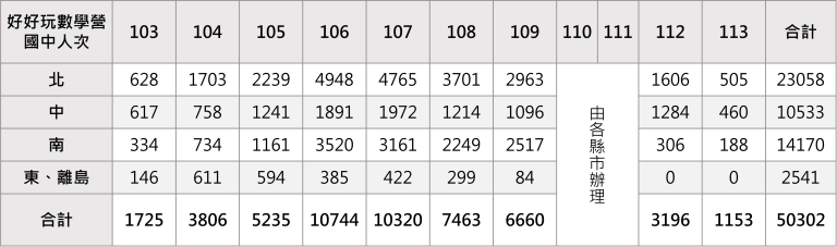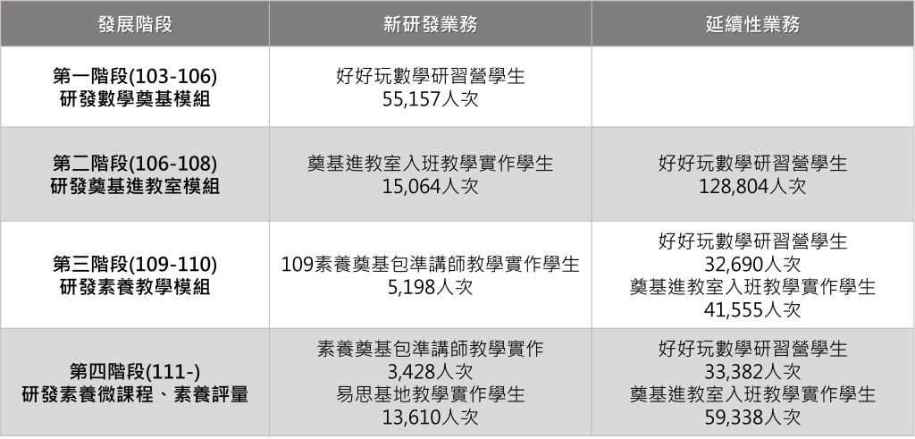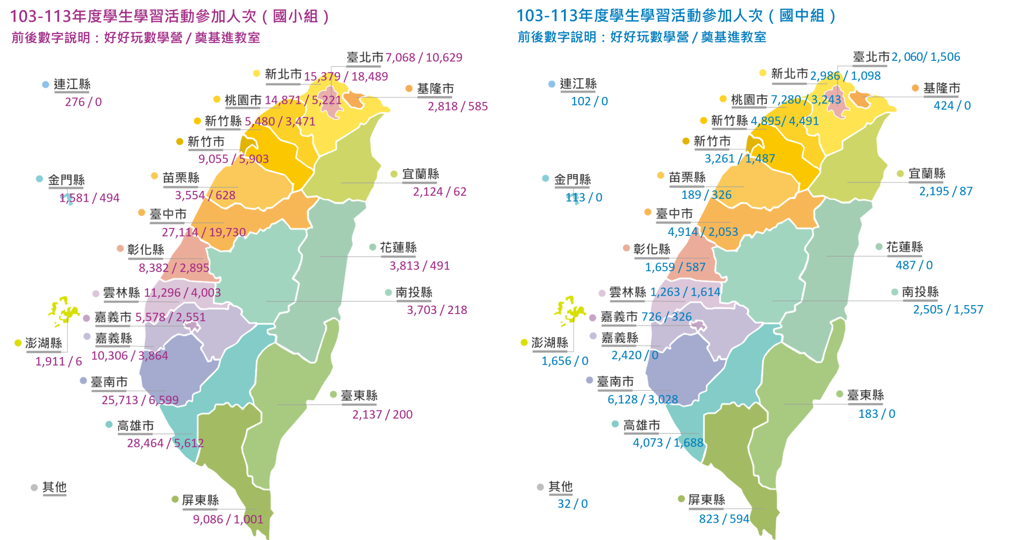 學生學習活動 概述 所有的研發活動都是為了讓學生有趣、有感、理解、素養到激發思考技能發展的學習機會,依此辦理一系列國小至國中的數學奠基活動。分述如下。 103 - 112年度 數學活動 一、數學奠基進教室入班教學實作 將現有奠基模組做適當的修正及轉化,進一步將數學奠基模組融入至一般正規課堂教學中推廣運用,使學生能在課堂中好好玩數學。於108年度開始辦理此活動。研習內容:選擇以3~8年級與數學基本學習內容相關且重要之內容所發展的奠基活動。年級及對象:3~8年級。辦理期程:於2月中~3月中申辦,並於4~6月底辦理進教室入班教學實作。於7月中~8月中申辦,並於9~1月中辦理進教室入班教學實作。 二、數學素養奠基包教學實作 數學單元素養模組包著重的是要從「有感理解推進到素養」的數學教學精進,其目標是要發展更精進、有效促進學生素養發展。於110年度開始辦理此活動。研習內容:選擇以3~8年級與數學基本學習內容相關且重要之內容所發展的素養奠基活動。年級及對象:3~8年級。辦理期程:於2月中~3月中申辦,並於4~6月底辦理素養教學實作。於7月中~8月中申辦,並於9~12月底辦理素養教學實作。 三、好好玩數學研習營(110-111年度由各縣市辦理) 配合學校數學課程中重要的概念為原則,在寒暑假、課後及週末辦理有趣的數學活動,以激發學生對數學的興趣。研習內容:選擇以3~8年級與數學基本學習內容相關且重要之內容所發展的奠基活動。年級及對象:3~8年級。辦理期程:於各學期開學日至結業式期間辦理「平日週末班」、寒假期間辦理「寒假班」、暑假期間辦理「暑假班」,並於各班別辦理前一個月開放申請報名。 四、年度教學研討會 亦定期舉辦地區性及年度的教學研討會,於年終辦理年度活動師大會師,邀請臺灣各地數學活動師於現場經驗分享,補助辦理數學活動之學校有義務參與此活動,並分享辦理好好玩數學營之經驗;另外,也歡迎有興趣的國中、小教師參與,讓辦理好好玩數學研習營之教師能透過研討會報告分享、課程共備及討論的過程,促進數學教學的專業成長。 五、103-113年度成果(統計至114年8月) 北:臺北市、基隆市、新北市、桃園市、新竹縣市、宜蘭縣中:臺中市、苗栗縣、南投縣、彰化縣、雲林縣南:高雄市、臺南市、嘉義縣市、屏東縣東、離島:臺東縣、花蓮縣、澎湖縣、金門縣、連江縣